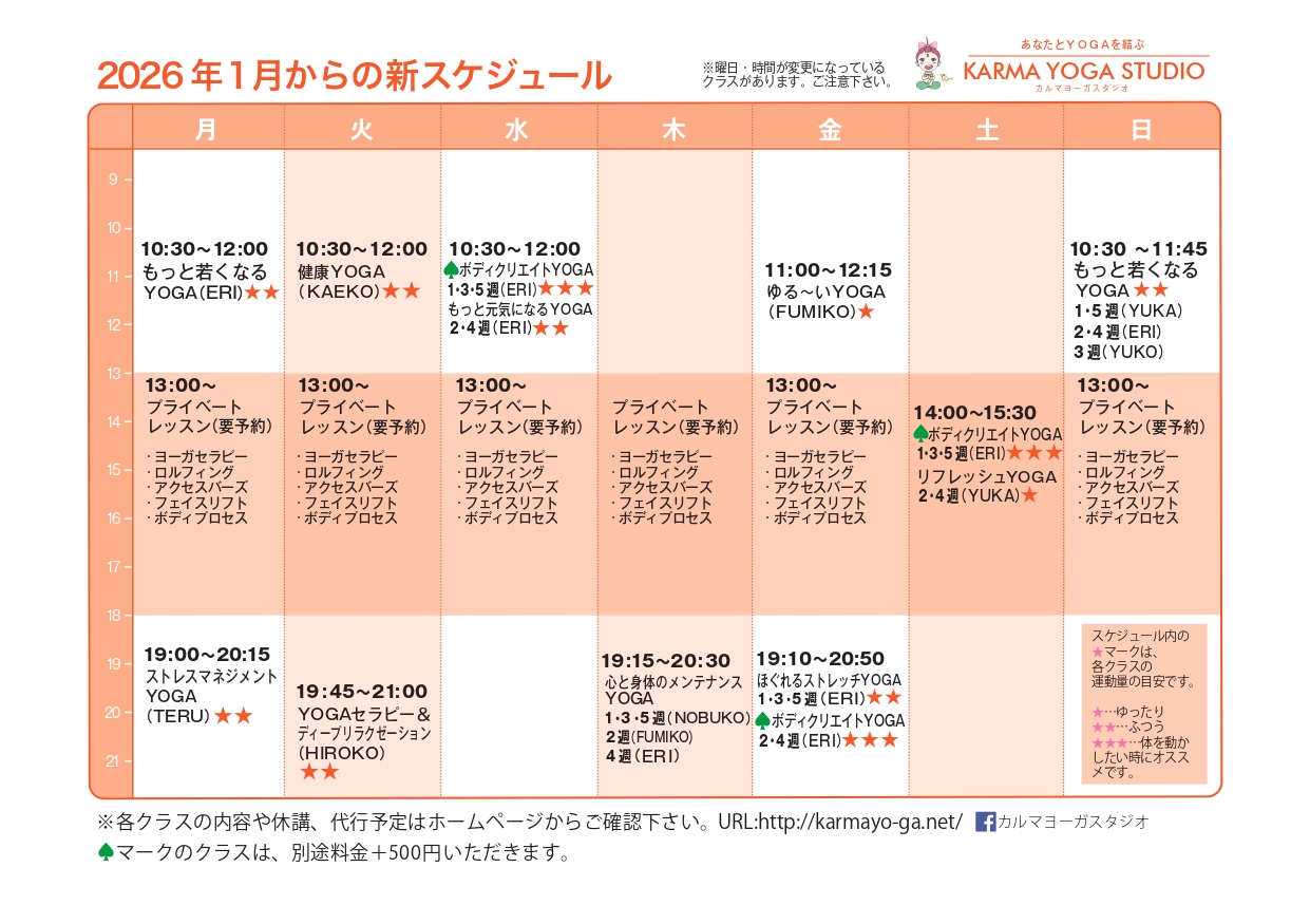 スケジュール表(2026年1月から) ※基本的に予約なしで受講できます。お問い合わせは、お電話か下記フォームからメールでお願いします。 ※プライベートレッスンは受講予約が必要です。お電話か下記フォームからメールで受講予約をお願いします。 お問い合わせフォーム 携帯のメールアドレスを入力された方で指定受信をしている方は、 必ず「karmayoga2012@gmail.com」を指定受信リストに追加した上でお申し込み下さい。 お名前[必須] 電話番号[必須] Email[必須] Email(確認)[必須] 予約日[必須] お問い合わせ内容[必須] トライアル申込み 受講のご予約 派遣のご依頼 お問い合わせ その他 お問い合わせ詳細[必須]